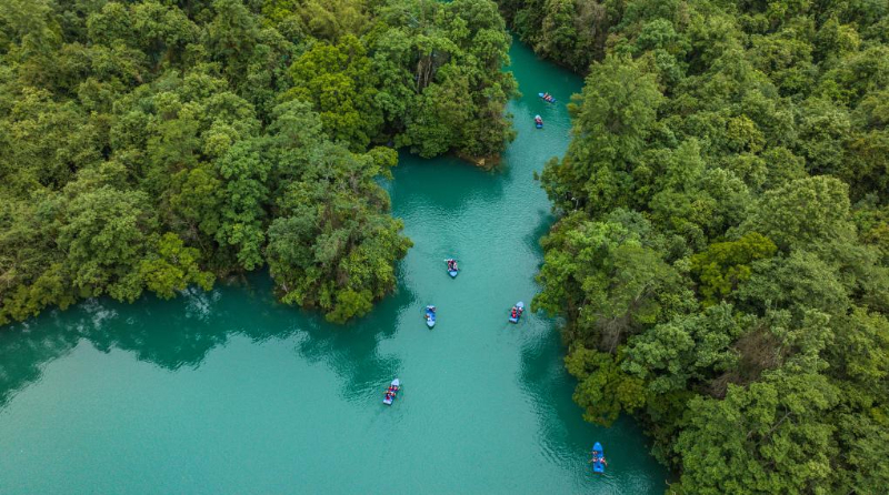 游客在荔波縣小七孔景區(qū)劃船游玩(5月16日攝,無人機(jī)照片)。新華社記者 陶亮 攝