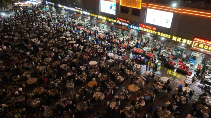 在江蘇盱眙的大桐農(nóng)貿(mào)市場(chǎng),聚集著數(shù)十家以經(jīng)營小龍蝦為主的餐飲店、大排檔。暮色降臨,數(shù)千平方米的露天廣場(chǎng)上,游客座無虛席,空氣中彌漫著撲鼻香氣。