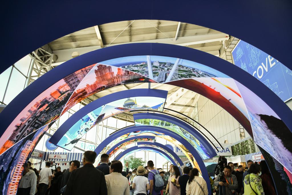 5月18日,參會者走進(jìn)在哈爾濱國際會展中心舉行的第八屆中俄博覽會展館。新華社記者 王松 攝