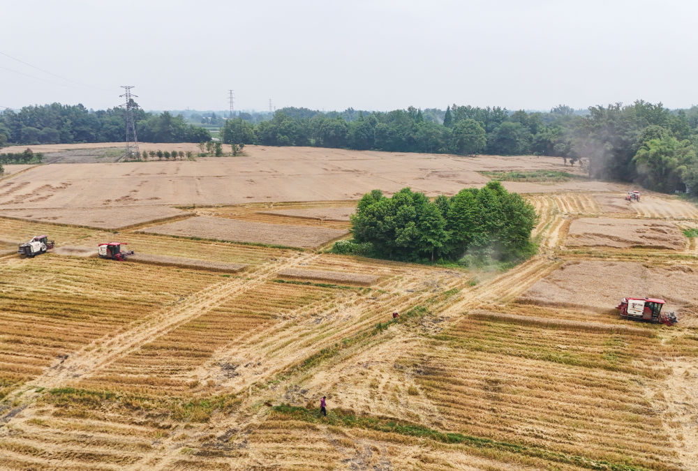 在四川成都崇州市三江街道古泉村,收割機(jī)在麥田里收割小麥(5月15日攝)。