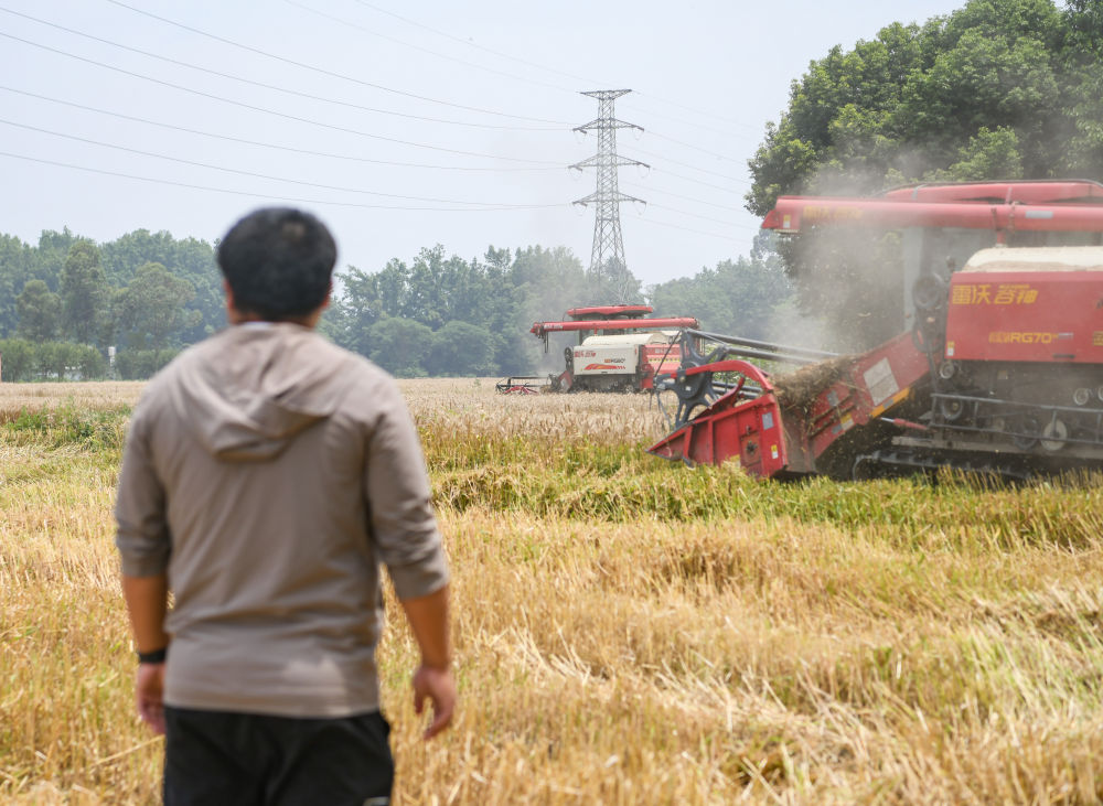 在四川成都崇州市三江街道古泉村,舒星宇在麥田邊觀看小麥?zhǔn)崭顧C(jī)作業(yè)(5月15日攝)。