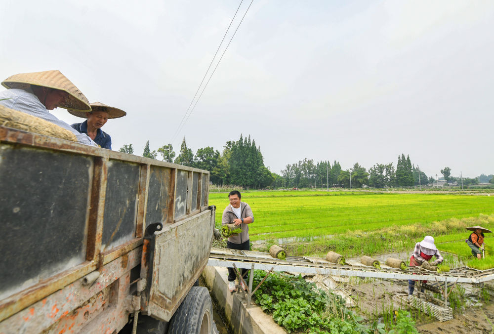 在四川成都崇州市大劃街道石橋村,舒星宇(左三)在幫忙運(yùn)送秧盤(5月15日攝)。