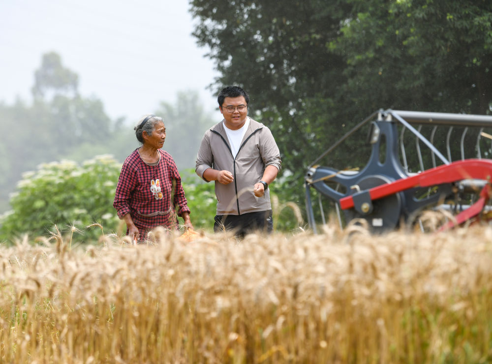 在四川成都崇州市三江街道古泉村,舒星宇(右)和工人溝通補(bǔ)割的安全注意事項(xiàng)(5月15日攝)。