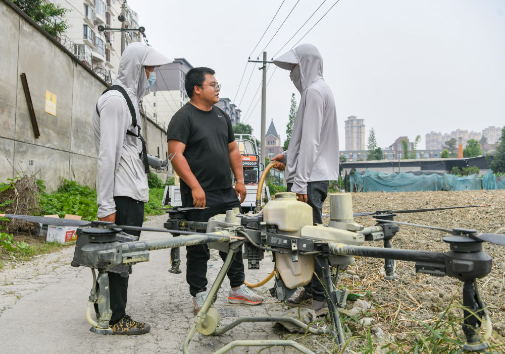 在四川成都溫江區(qū)萬(wàn)春鎮(zhèn),舒星宇(中)和植保無(wú)人機(jī)飛手在溝通當(dāng)天打藥的區(qū)域和作業(yè)時(shí)間(5月16日攝)。