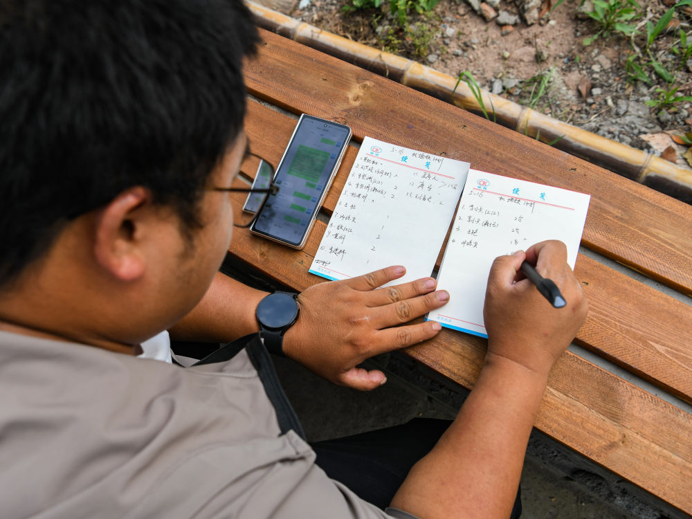 在四川省成都東部新區(qū)董家埂鎮(zhèn)小河村,舒星宇在安排第二天的機(jī)插秧計(jì)劃(5月15日攝)。