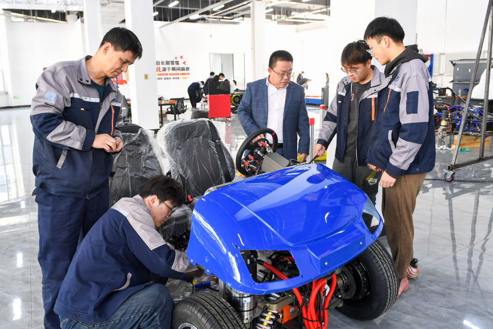 2024年3月13日,長(zhǎng)春市麥迪克智行汽車科技有限公司,吉林大學(xué)汽車工程學(xué)院教授靳立強(qiáng)(右三)與同事檢查智能底盤樣車。新華社記者 張楠 攝