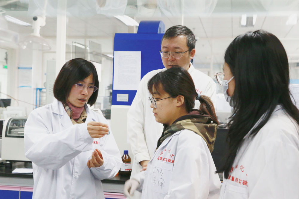 大連理工大學(xué)化工學(xué)院樊江莉(左)教授與同事及學(xué)生查看實(shí)驗(yàn)結(jié)果(2021年11月攝)。新華社發(fā)
