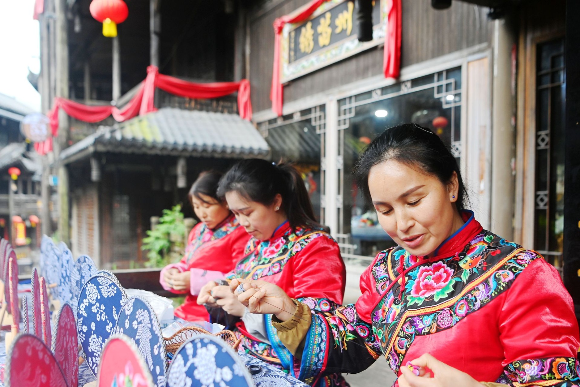 繡娘們給苗繡飾品穿線