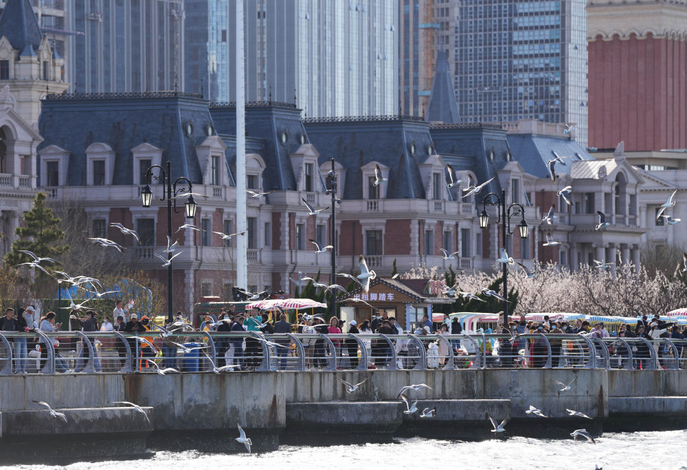 2024年4月16日,在遼寧省大連市東港商務區(qū),游客在海邊休閑觀光。 新華社記者 李鋼 攝