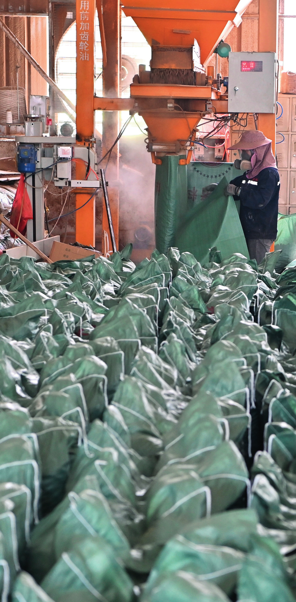 工作人員在廣西來(lái)賓小平陽(yáng)鎮(zhèn)一家飼料廠將甘蔗葉為主要原料的飼料裝袋(2023年12月12日攝)周華攝