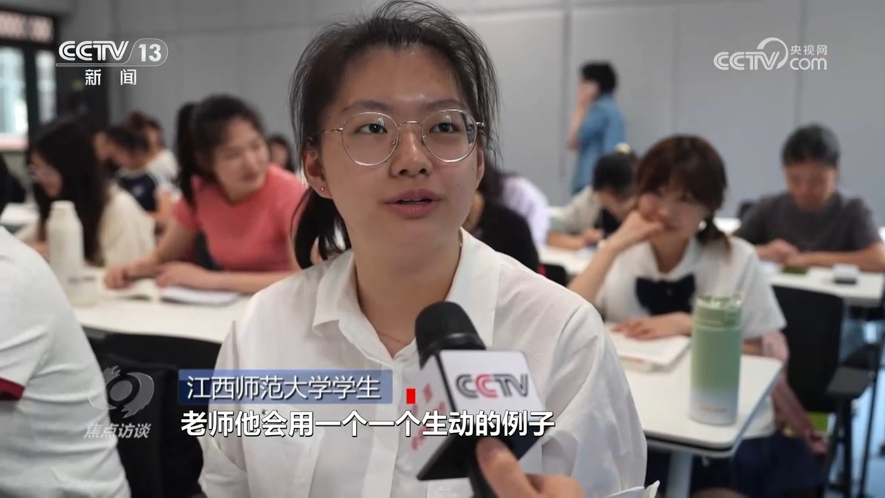 江西師范大學(xué)學(xué)生:“老師他會(huì)用一個(gè)生動(dòng)的例子來表達(dá)他的觀點(diǎn),然后也會(huì)用一些讓人感覺很熱血沸騰的,也有那種催人眼淚的故事,然后來激蕩我的心靈?!?/p>