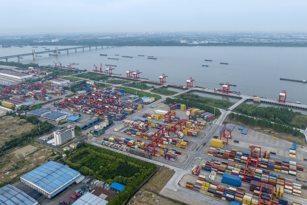 5月26日拍攝的安徽蕪湖港朱家橋港區(qū)國(guó)際集裝箱碼頭(無人機(jī)照片)。 新華社發(fā)(肖本祥 攝)
