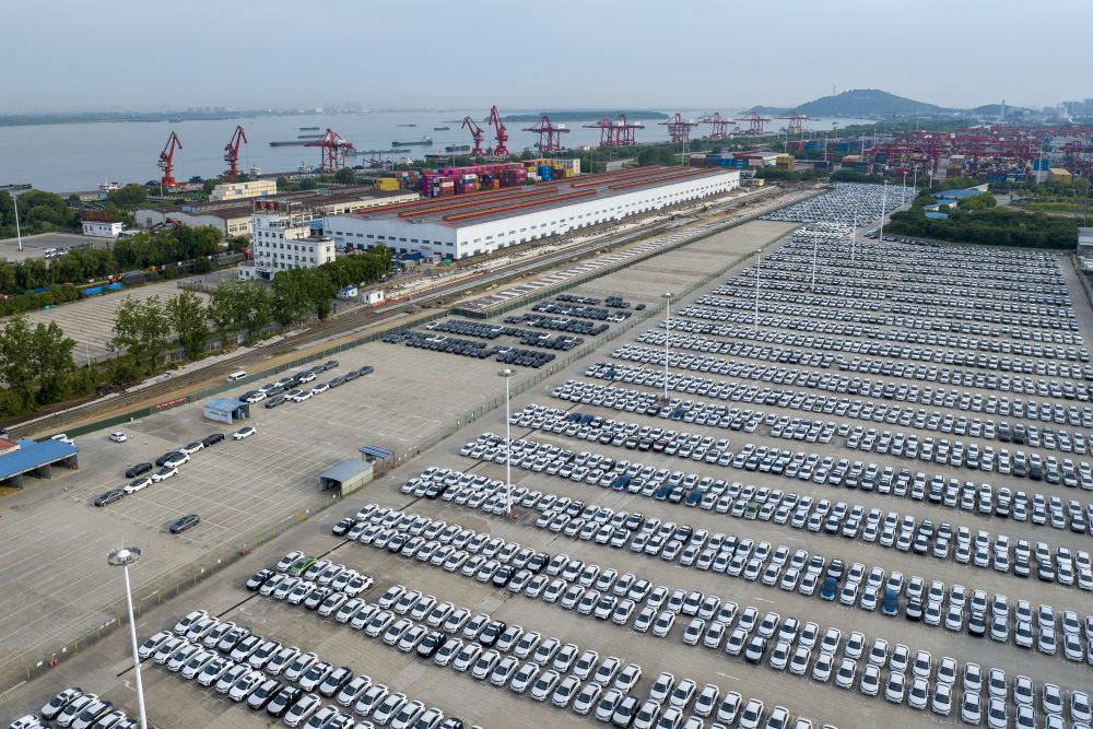5月26日,在安徽蕪湖港朱家橋港區(qū)國(guó)際集裝箱碼頭,整齊排列的汽車等待出口(無人機(jī)照片)。 新華社發(fā)(肖本祥 攝)