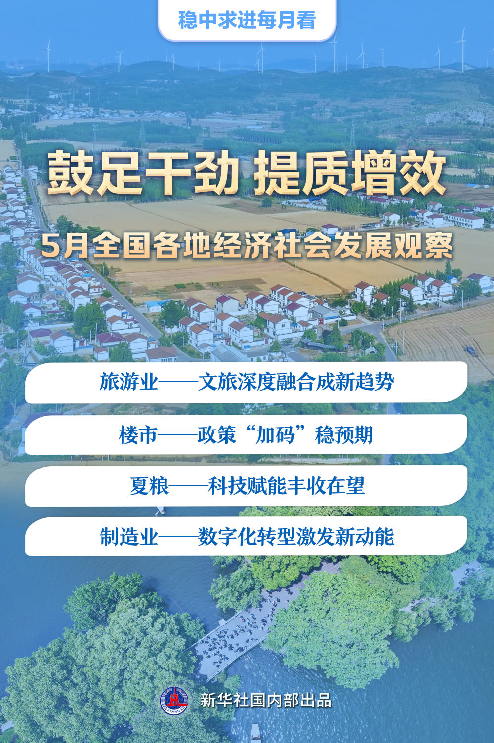 春歸夏至,萬物生長。文旅融合向“深”挺進,樓市政策優(yōu)化調(diào)整,夏收以科技賦能,制造業(yè)數(shù)字化轉(zhuǎn)型提速……提質(zhì)增效成為5月全國各地經(jīng)濟社會發(fā)展的突出特點。