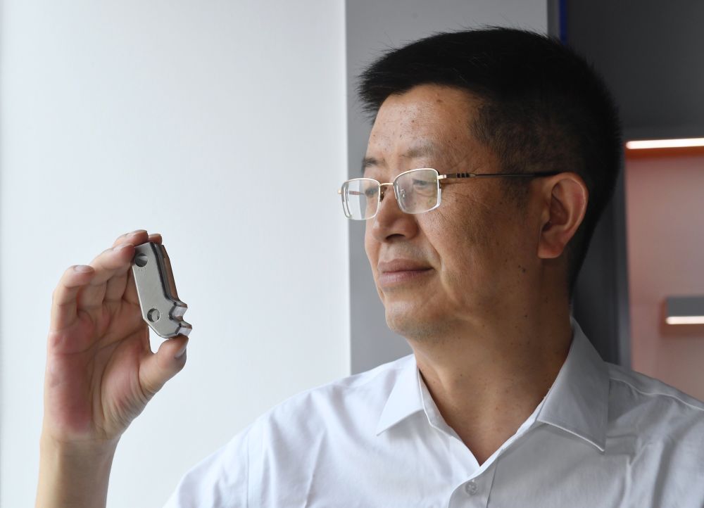 5月24日,在位于成都的中國核動力研究設(shè)計(jì)院內(nèi),鐘元章在展示通過3D打印的堆內(nèi)構(gòu)件堆芯圍筒。鐘元章介紹,通過3D打印的方式來生產(chǎn)“華龍一號”的零部件,是目前的一個(gè)研究方向。