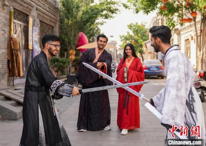 圖為邯森等4名巴基斯坦留學生在回車巷歷史文化街區(qū)穿漢服,感受中國傳統(tǒng)文化。王倩倩 攝