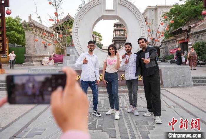 圖為邯森等4名巴基斯坦留學生在回車巷歷史文化街區(qū)拍照留念。王倩倩攝