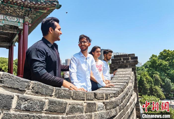 圖為邯森等4名巴基斯坦留學生登上叢臺。王倩倩攝