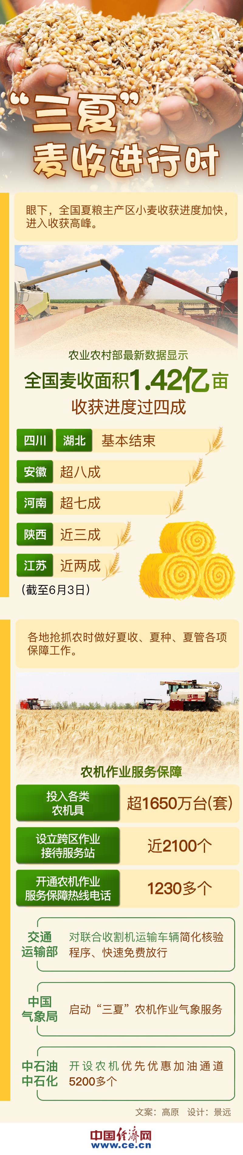 目前,麥?zhǔn)帐》菀言O(shè)立跨區(qū)作業(yè)接待服務(wù)站近2100個(gè),開通農(nóng)機(jī)作業(yè)服務(wù)保障熱線電話1230多個(gè);交通運(yùn)輸部印發(fā)通知,對聯(lián)合收割機(jī)運(yùn)輸車輛進(jìn)一步簡化核驗(yàn)程序、快速免費(fèi)放行;中國氣象局啟動“三夏”農(nóng)機(jī)作業(yè)氣象服務(wù),助力打好機(jī)收大會戰(zhàn)。各地中石油、中石化等開設(shè)農(nóng)機(jī)優(yōu)先優(yōu)惠加油通道5200多個(gè),組織開展“送油到田”服務(wù),全力保障作業(yè)用油供給。