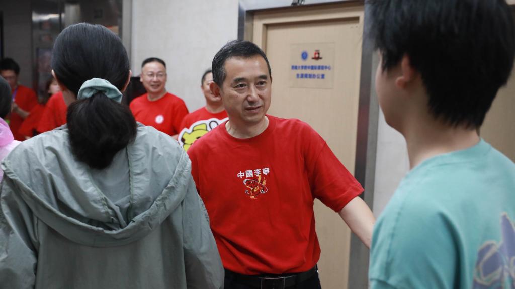 6月7日,北京一零一中學(xué)的送考老師們在校門口為考生加油鼓勁。(北京一零一中學(xué)供圖)
