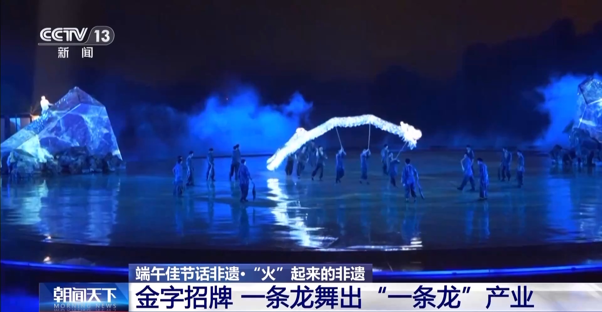 非遺的核心技藝在生產(chǎn)實(shí)踐中得到傳承。眼下,光是龍燈扎制業(yè)務(wù),已經(jīng)遍布全國(guó)十幾個(gè)省份,平均每年訂單超過1000萬(wàn)元。如今,扎制好的龍燈,更多是被用在當(dāng)?shù)氐凝埼璞硌萆?。這是大型非遺山水實(shí)景劇《追夢(mèng) 銅梁龍》的演出現(xiàn)場(chǎng),觀眾可以看到水云龍、荷花龍等十幾種銅梁傳統(tǒng)龍舞,其中壓軸戲,便是銅梁火龍。