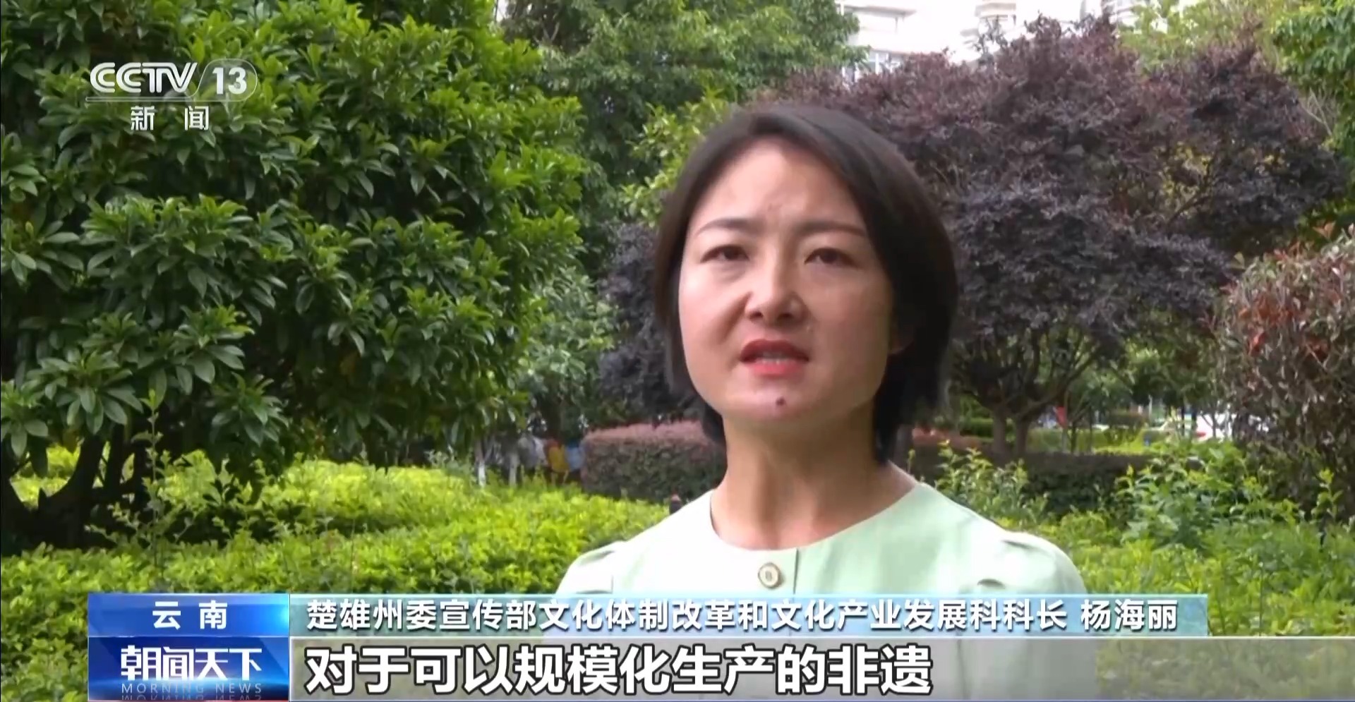 楚雄州委宣傳部文化體制改革和文化產(chǎn)業(yè)發(fā)展科科長(zhǎng) 楊海麗:對(duì)于可以規(guī)模化生產(chǎn)的非遺,我們提倡生產(chǎn)性保護(hù)。適當(dāng)引導(dǎo)非遺工藝加大與創(chuàng)意設(shè)計(jì)的融合力度,推動(dòng)產(chǎn)品開發(fā)向多元領(lǐng)域拓展,變成文化產(chǎn)品、時(shí)尚產(chǎn)品、潮流產(chǎn)品。