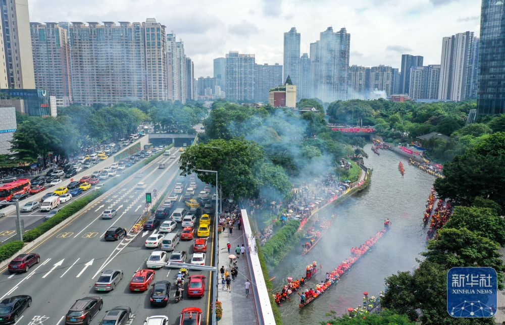 6月10日,獵德村熱鬧的傳統(tǒng)龍舟“龍船景”與繁忙的現(xiàn)代都市交匯相融(無(wú)人機(jī)照片)?!褒埓啊笔菑V府地區(qū)水鄉(xiāng)在端午期間舉辦的一種民俗活動(dòng)。新華社記者 劉大偉 攝