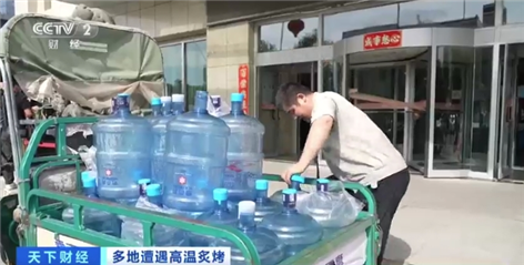 高溫天氣下,出行的人們打起了遮陽傘、戴上了遮陽帽。 受高溫天氣影響,人們對飲用水的需求也增加不少,在烏魯木齊市的一處樓宇,送水工人比平時忙碌很多。