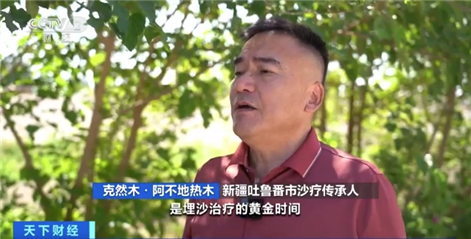 新疆吐魯番市沙療傳承人 克然木·阿不地熱木:每年6月份至9月份是埋沙治療的黃金時間,去年我們共接待游客10萬人次,今年有望進一步突破。