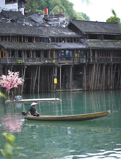 湖南湘西土家族苗族自治州鳳凰古城的吊腳樓沿沱江而建,鱗次櫛比,錯(cuò)落有致。古色古香的建筑通風(fēng)防潮,避暑御寒,極具工藝審美和文物研究?jī)r(jià)值。圖為鳳凰古城吊腳樓一瞥。