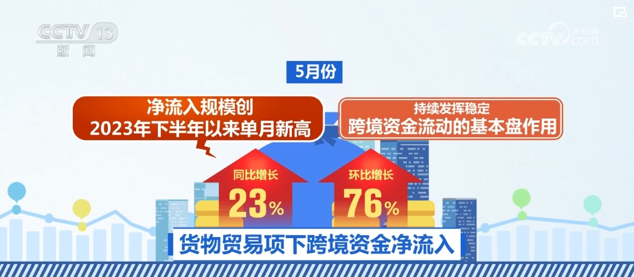 5月份,貨物貿(mào)易項下跨境資金凈流入同比和環(huán)比分別增長23%和76%,凈流入規(guī)模創(chuàng)2023年下半年以來單月新高,持續(xù)發(fā)揮穩(wěn)定跨境資金流動的基本盤作用。同時,外資配置人民幣資產(chǎn)意愿較強,5月份,凈買入境內(nèi)債券320億美元,環(huán)比增長86%,處于歷史較高水平。此外,境內(nèi)主體對外各類投資更加平穩(wěn)有序。