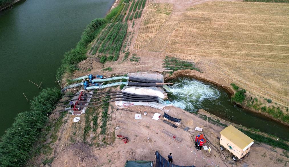 6月18日,在山東省巨野縣麒麟鎮(zhèn)的一處抗旱應(yīng)急取水點,水泵正在抽水輸入農(nóng)田灌溉渠道(無人機照片)。新華社記者 徐速繪 攝