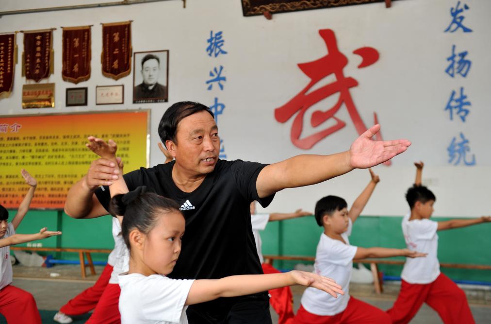 2017年6月17日,石同鼎(中)在泊頭六合武館內教授小學生六合拳法。