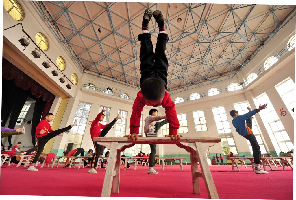 2014年10月24日,吳橋國際雜技藝術學校的學生們在練功。