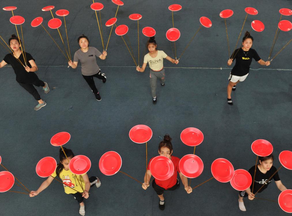 2018年7月30日,來自老撾的留學生們在吳橋雜技藝術學校內練習轉碟。