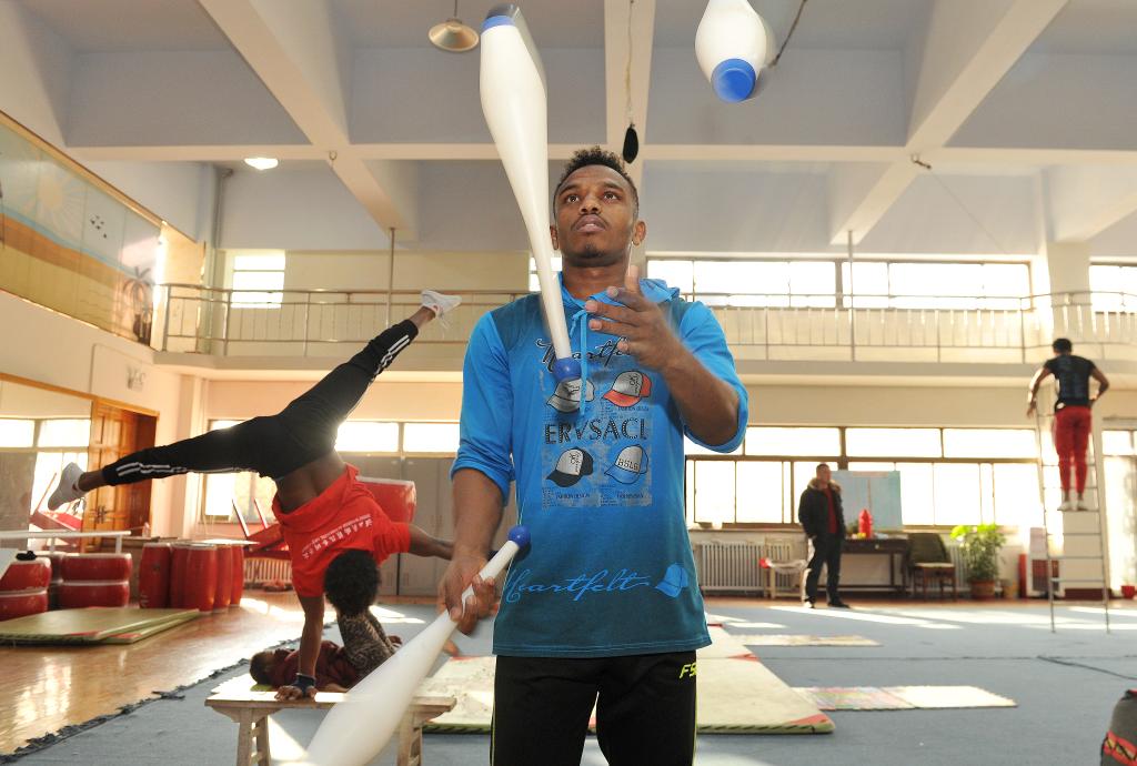 2018年1月25日,在吳橋雜技藝術學校,來自埃塞俄比亞的留學生依布薩(中)在練習雜技。