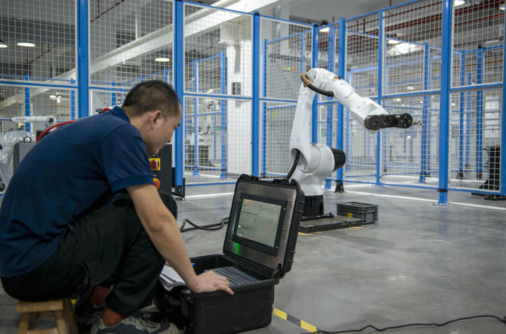 在廣東拓斯達科技股份有限公司,工作人員對一臺工業(yè)機器人進行絕對定位精度的校準(zhǔn)(5月17日攝)。新華社記者 徐嘉懿 攝