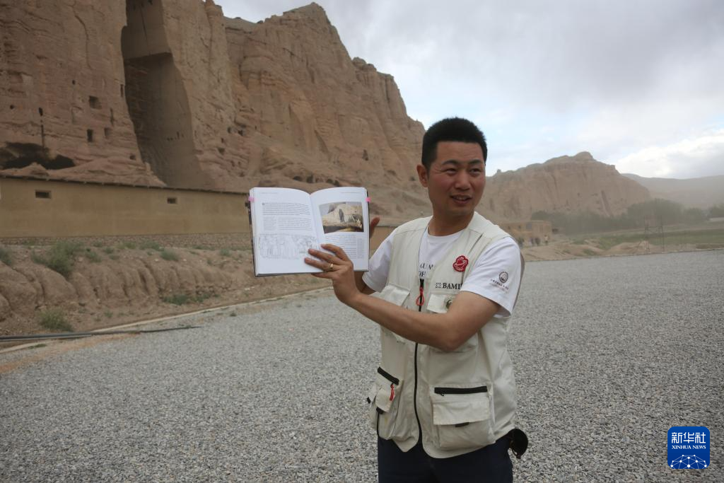 6月15日,在阿富汗巴米揚(yáng)省的巴米揚(yáng)大佛遺址區(qū),中國學(xué)者邵學(xué)成展示書中記載的巴米揚(yáng)大佛相關(guān)內(nèi)容。新華社發(fā)(塞夫拉赫曼·薩菲攝)