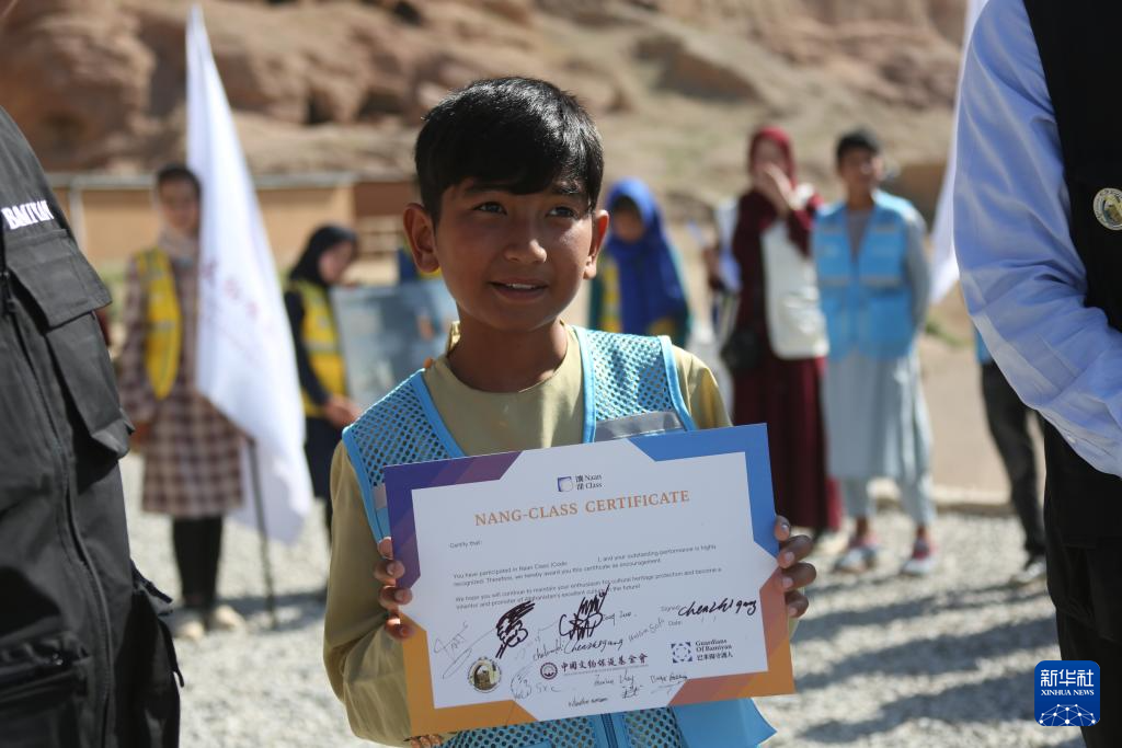 6月16日,在阿富汗巴米揚(yáng)省的巴米揚(yáng)大佛遺址區(qū),參加“馕課”的當(dāng)?shù)貙W(xué)生穆罕默德·扎伊德展示榮譽(yù)證書。新華社發(fā)(塞夫拉赫曼·薩菲攝)