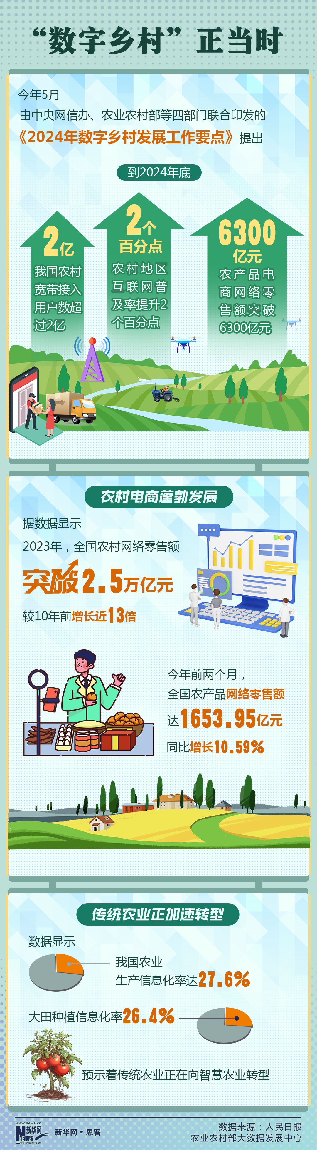 隨著網絡等基礎設施不斷向鄉(xiāng)村延伸,傳統農業(yè)正加速向智慧農業(yè)轉型。數據顯示,我國農業(yè)生產信息化率已達27.6%,大田種植信息化率也達到了26.4%。這一轉變不僅提高了農業(yè)生產效率,也提升了農產品的質量,為鄉(xiāng)村振興注入了新的活力。