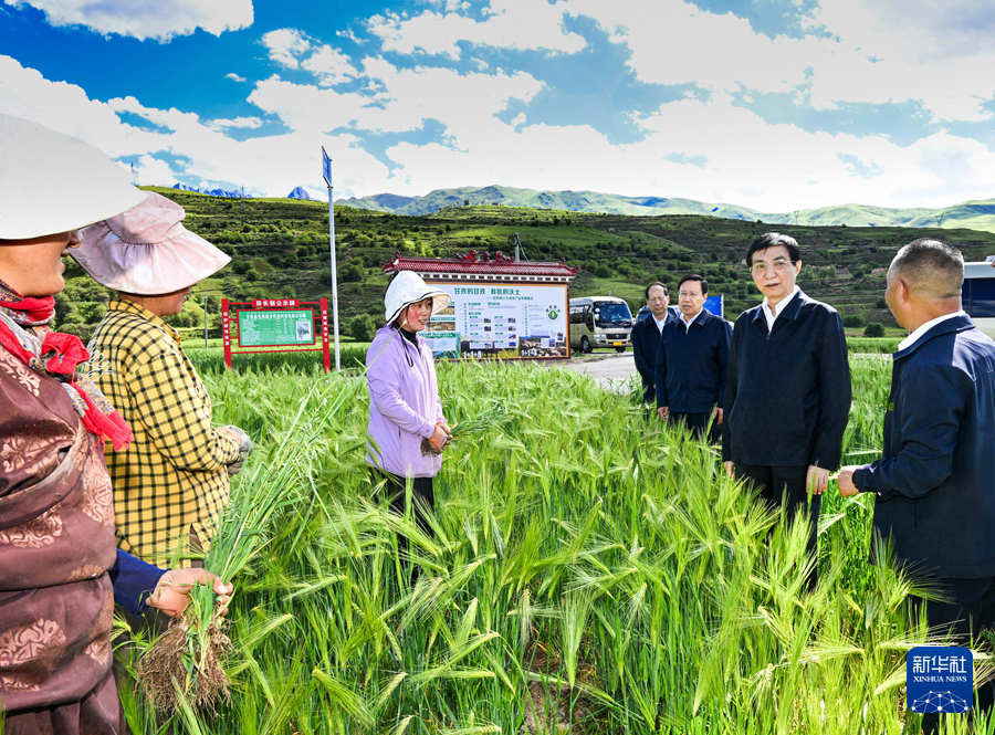 7月1日至3日,中共中央政治局常委、全國政協(xié)主席王滬寧在四川甘孜、阿壩調研。這是7月1日王滬寧在甘孜縣了解青稞生產情況。新華社記者 饒愛民 攝