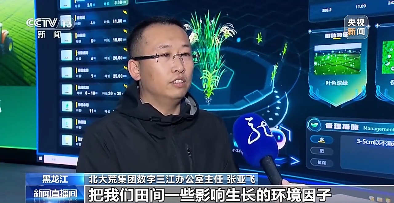 北大荒集團(tuán)數(shù)字三江辦公室主任 張亞飛:通過無人機(jī)群把我們田間的一些影響生長的環(huán)境因子采集回來,然后輸入到我們的大模型之內(nèi),采取的手段是空、天、地、人機(jī)一體化的感知手段,形成當(dāng)時(shí)、當(dāng)季需要進(jìn)行的農(nóng)事活動(dòng)的決策指令,通過這個(gè)數(shù)字生產(chǎn)模型來指導(dǎo)我們的種植戶更加科學(xué)地進(jìn)行種植,提高水稻單產(chǎn)。