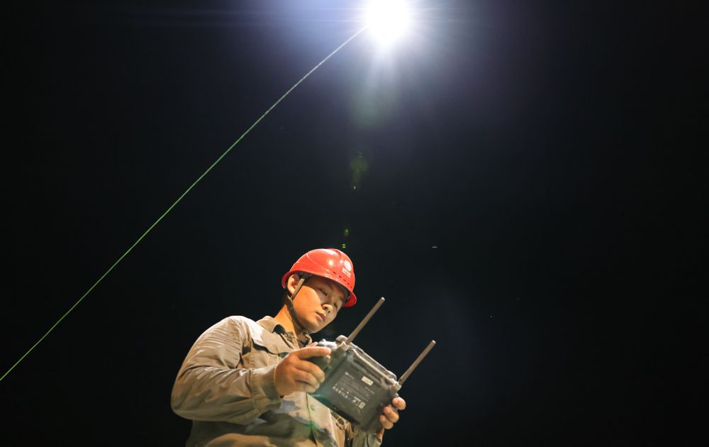 在堵口作業(yè)現(xiàn)場,劉子翔負(fù)責(zé)操作系留式無人機(jī),為施工人員提供夜間照明。他時刻注意風(fēng)向、風(fēng)速,根據(jù)施工人員的需求,及時調(diào)整無人機(jī)的位置,確?!罢盏靡?、照得亮”。