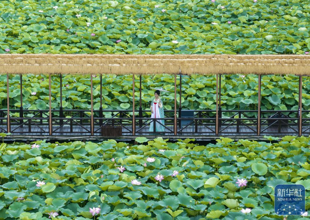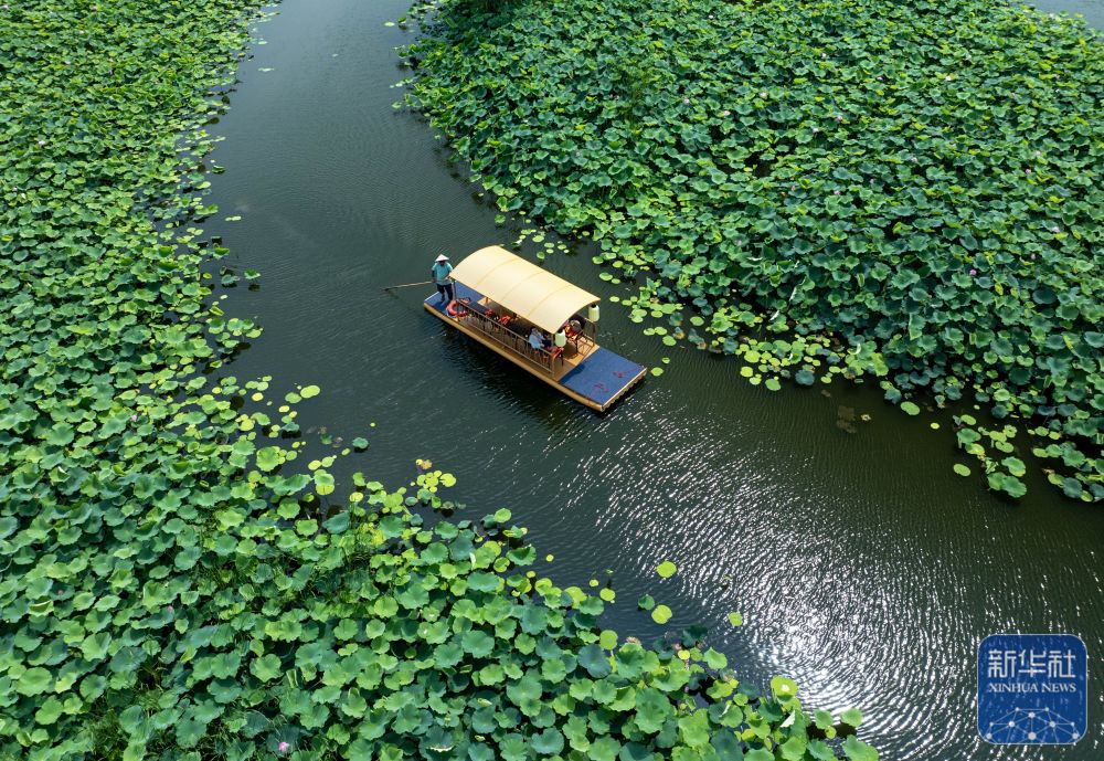 7月8日,游客在江蘇省興化市千垛鎮(zhèn)的萬畝荷塘景區(qū)賞荷游玩(無人機(jī)照片)。新華社發(fā)(周社根 攝)