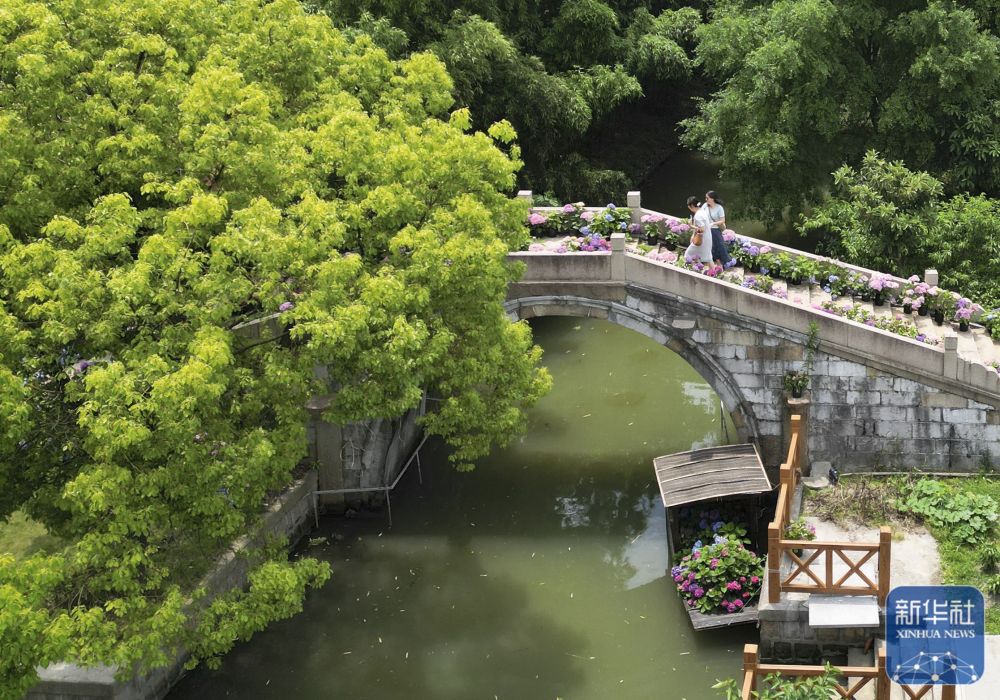 在上海東厙村,人們走過繡球花裝點(diǎn)的始建于明代的瑞龍橋(6月4日攝,無人機(jī)照片)。 新華社記者 劉穎 攝