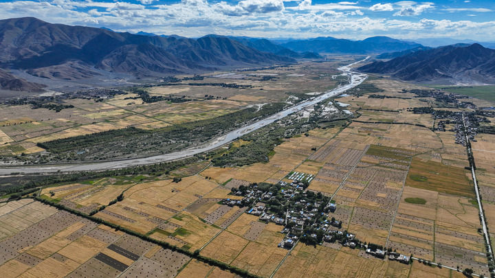 西藏日喀則市年楚河流域縱橫交錯的鄉(xiāng)村道路(2023年9月6日攝,無人機照片)。新華社記者 晉美多吉 攝