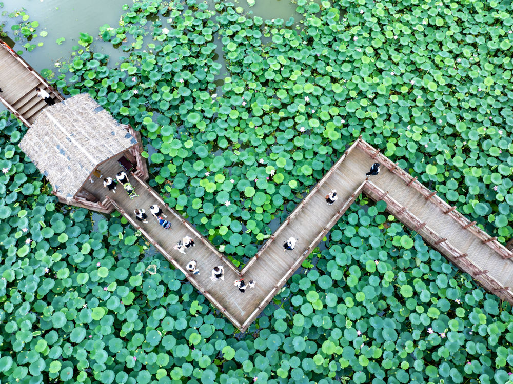 7月14日,游人在江蘇興化里下河國家濕地公園游玩(無人機(jī)照片)。新華社發(fā)(周社根攝)
