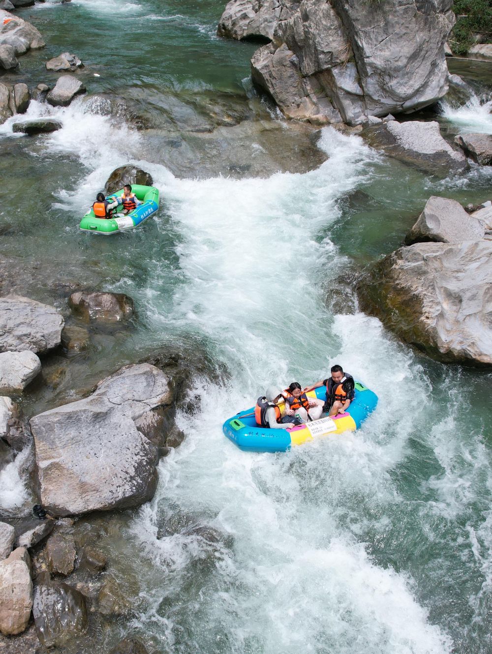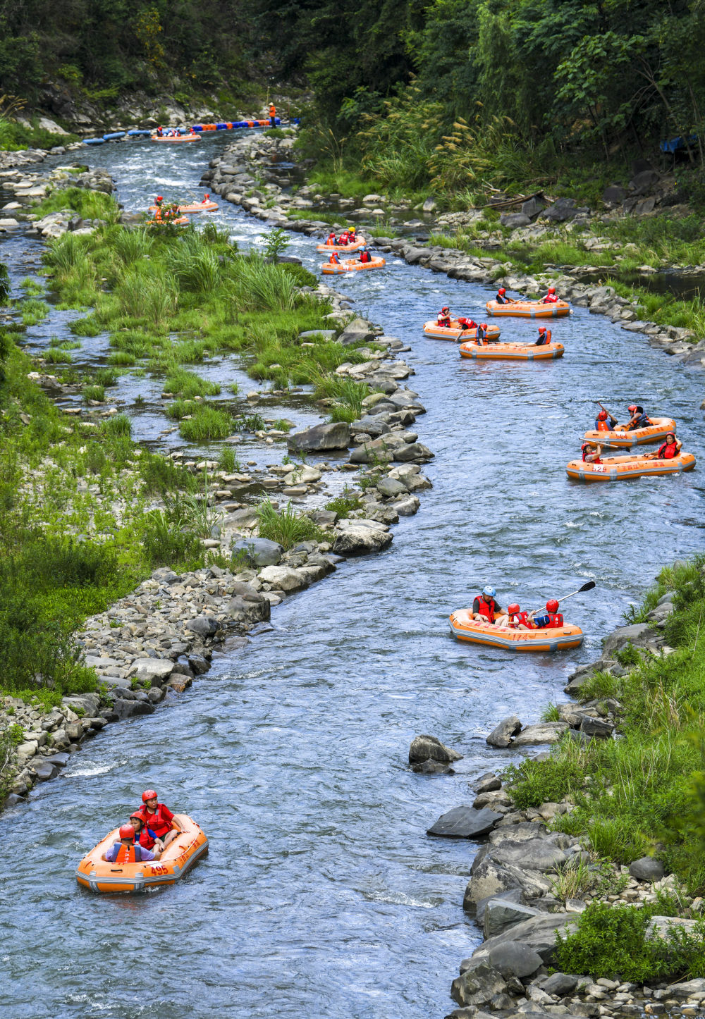 7月13日,游客在貴州省黔東南苗族侗族自治州施秉縣杉木河景區(qū)漂流(無人機(jī)照片)。新華社發(fā)(磨桂賓攝)