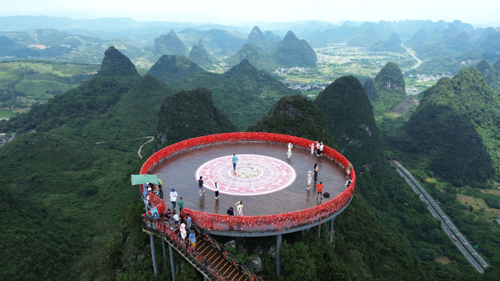 7月13日,游客在廣西桂林市陽朔縣如意峰觀景(無人機(jī)照片)。新華社發(fā)(廖祖平攝)