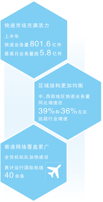 看發(fā)展動(dòng)力,上半年,快遞市場充滿活力、運(yùn)行良好,最高日業(yè)務(wù)量超5.8億件。
